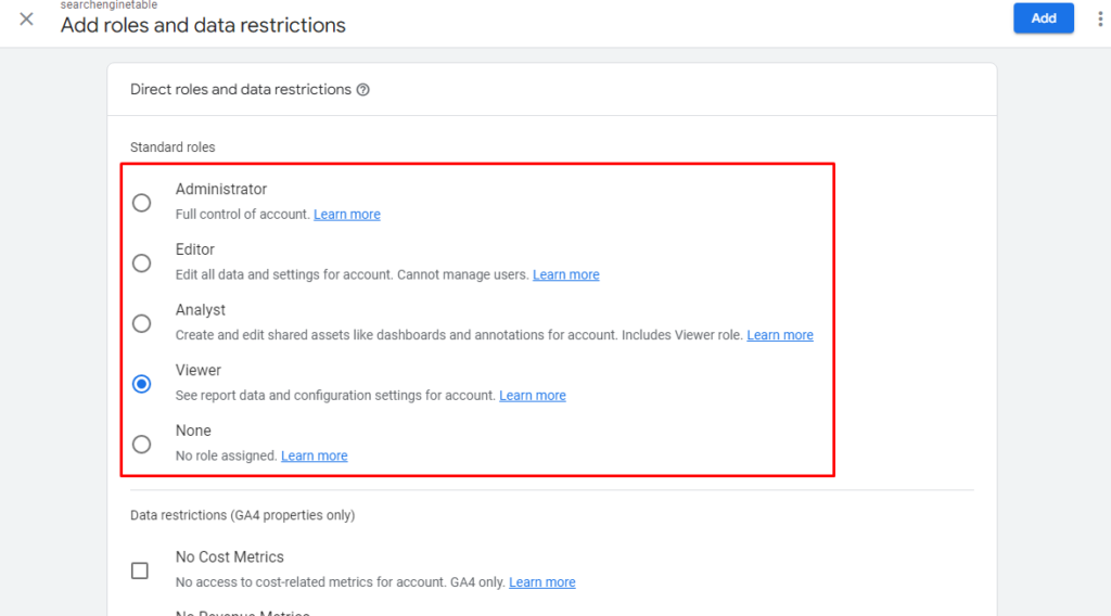 Step 5 – After clicking on the user management button, you will get access to a page where new users can be added. All you have to do is type their Gmail identity, select the level of access to be provided, select the notification box for the new user, and add. Indeed, you can keep a track of the levels of existing users too. As the process is completed, an email is sent to the new user on the added Gmail account for having shared access to your Google Analytics account.